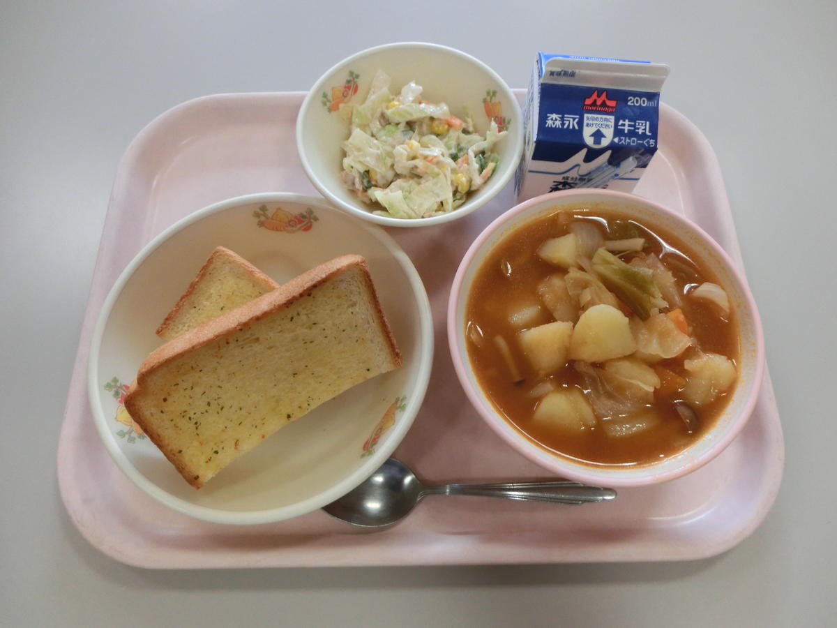 | なめし たまごスープ さかなのカリカリフライ たくあんあえ 牛乳 |