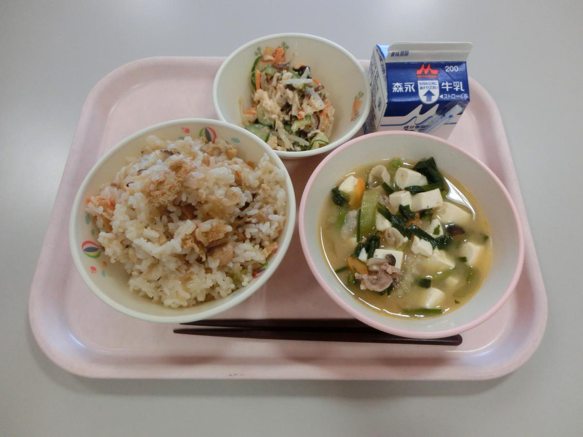 | キムチごはん わかめスープ あじごまフライ かっぱづけ 牛乳 |