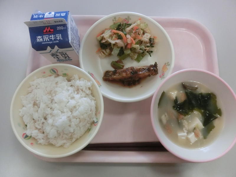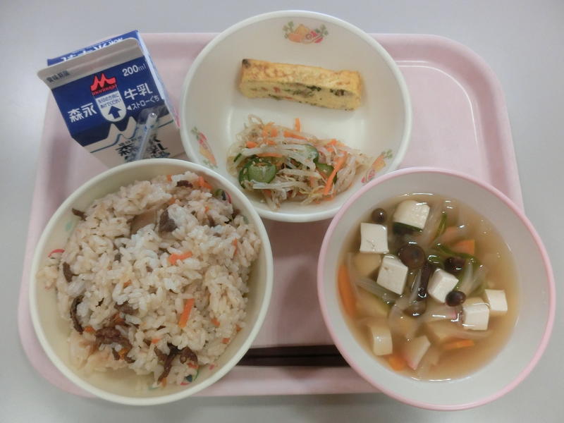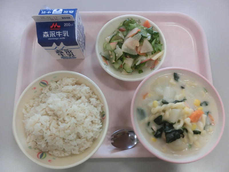 さくらごはん、すましじる、ちぐさやき、三色ナムル、牛乳
