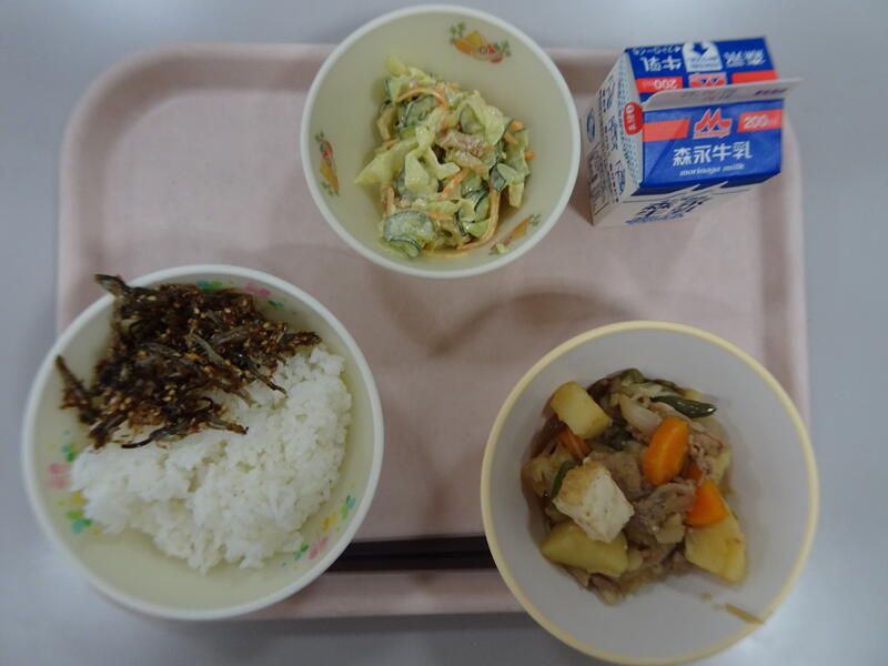 今日のメニュー:有機米ごはん、肉じゃが、野菜のカレーマヨサラダ、手作り佃煮、牛乳