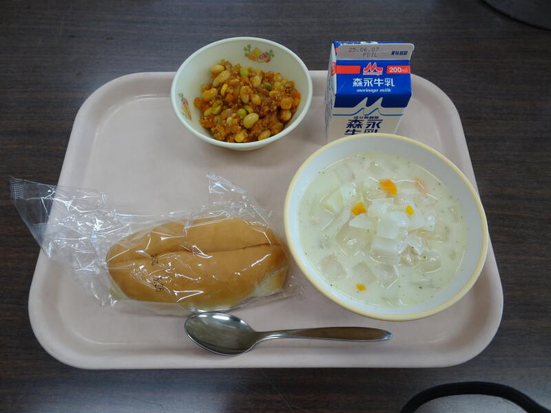 今日のメニュー :セルフドッグ(コッペパン)、クリームスープ、チリコンカン、牛乳