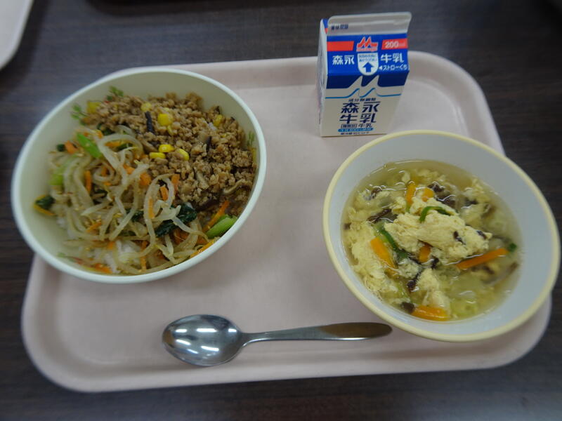 今日のメニュー :ビビンバ(麦ごはん、豚肉甘辛、ナムル)、中華風卵スープ、牛乳