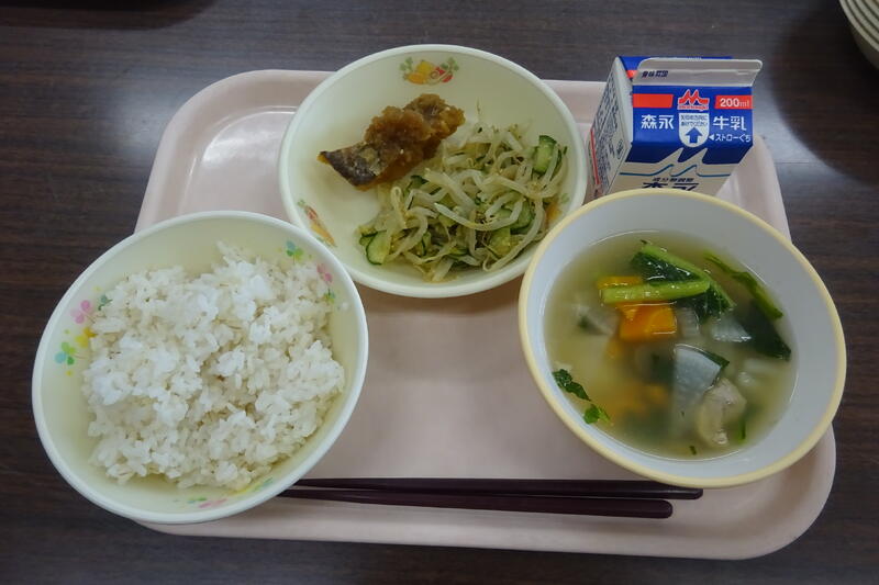 本日のお品書き:麦ごはん・白玉汁・魚 のおろしソース・きゅうりのごまあえ・牛乳