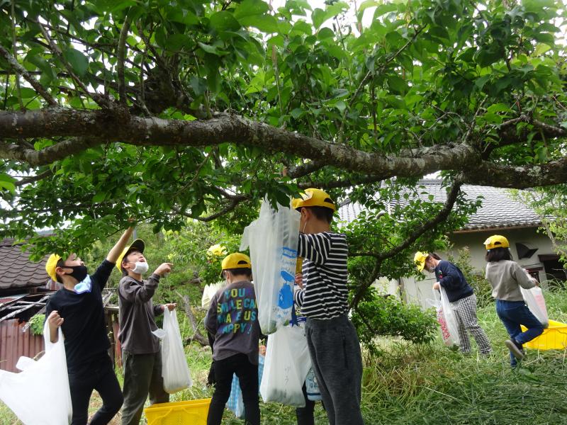 曇り空の少し涼しい風が吹く中、1、2年生で梅ちぎりをしました!!