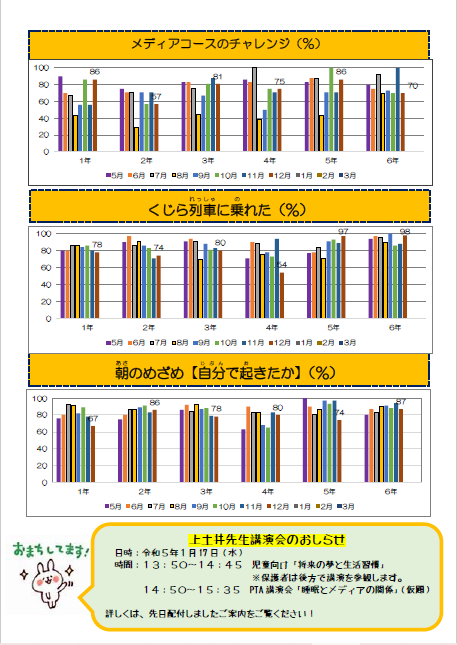 朝晩の冷え込みからか、先月のぐっすりすいみん週間では、全体的に少しだけ起きるのが遅くなっていましたが、メディアコースを5つ達成できた人は増えていました