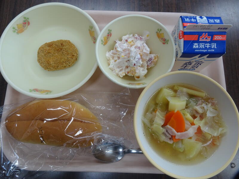 本日のお品書き:フルーツクリームサンド(コッペパン・フルーツクリーム)・マカロニスープ・チキンメンチカツ・牛乳