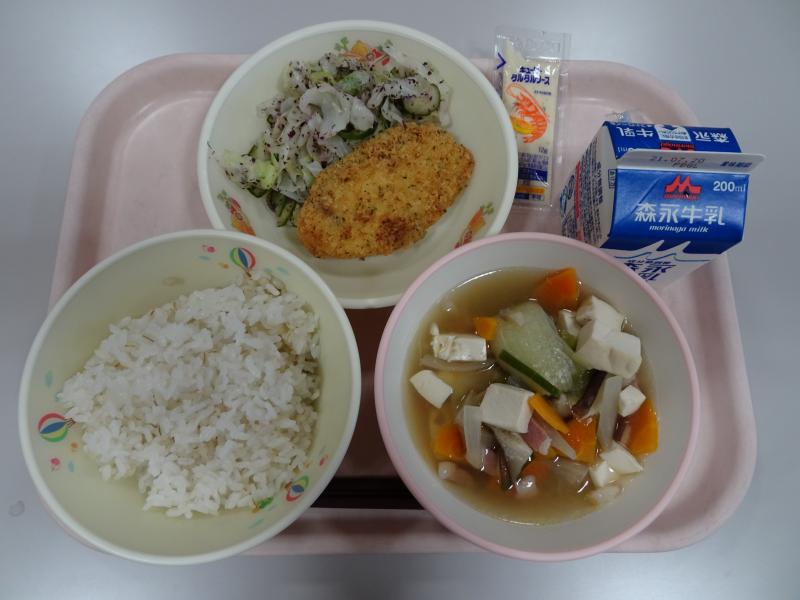麦ご飯、牛乳、冬瓜スープ、鯛の磯辺フライ、キャベツのゆかり和え