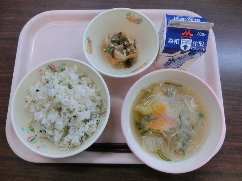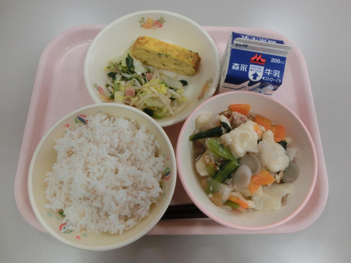 | むぎごはん だごじる こまつなしらすたまごやき なやき 牛乳 |