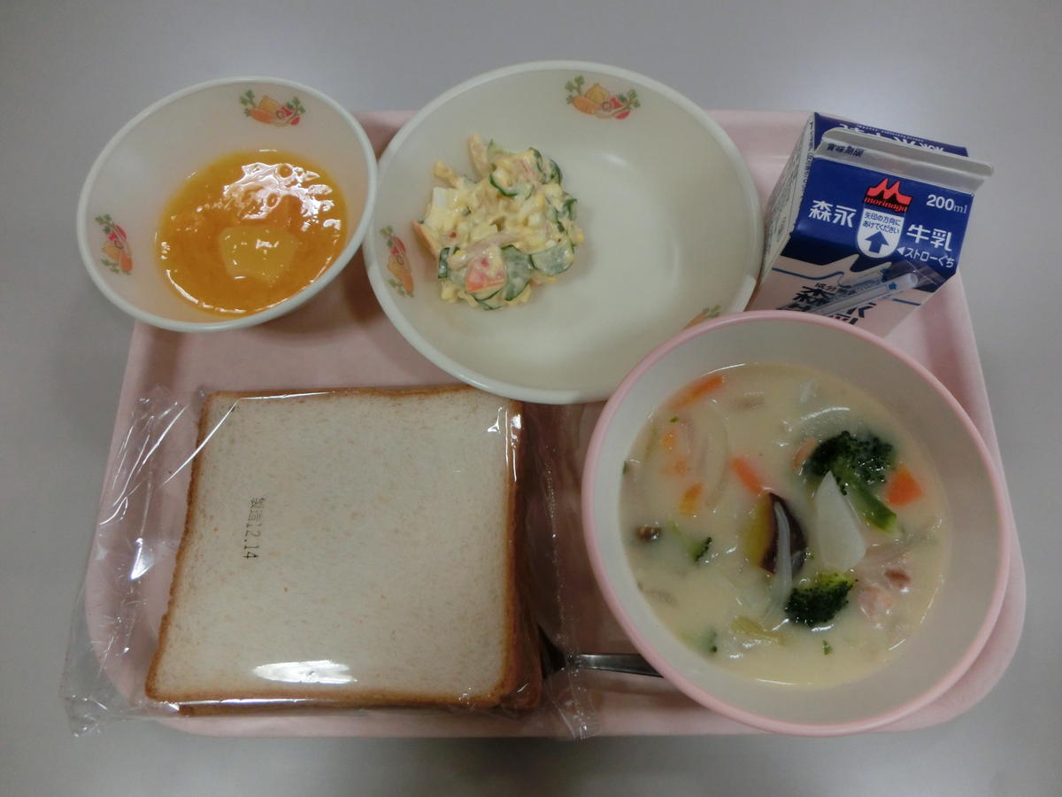 | エッグサンド ふゆやさいいりのシチュー 手作りみかんゼリー 牛乳 |