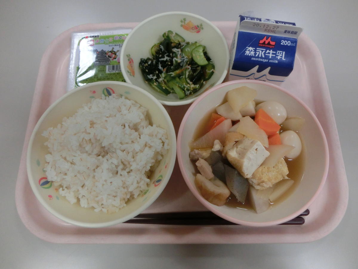 | むぎごはん なっとう おでん きゅうりのすのもの 牛乳 |