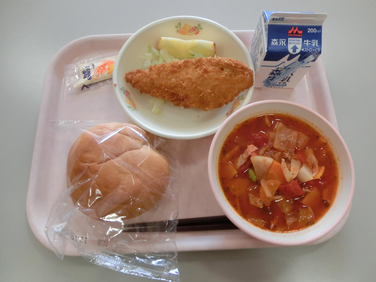 | セルフフィッシュバーガー まめとトマトのスープ りんご 牛乳 |