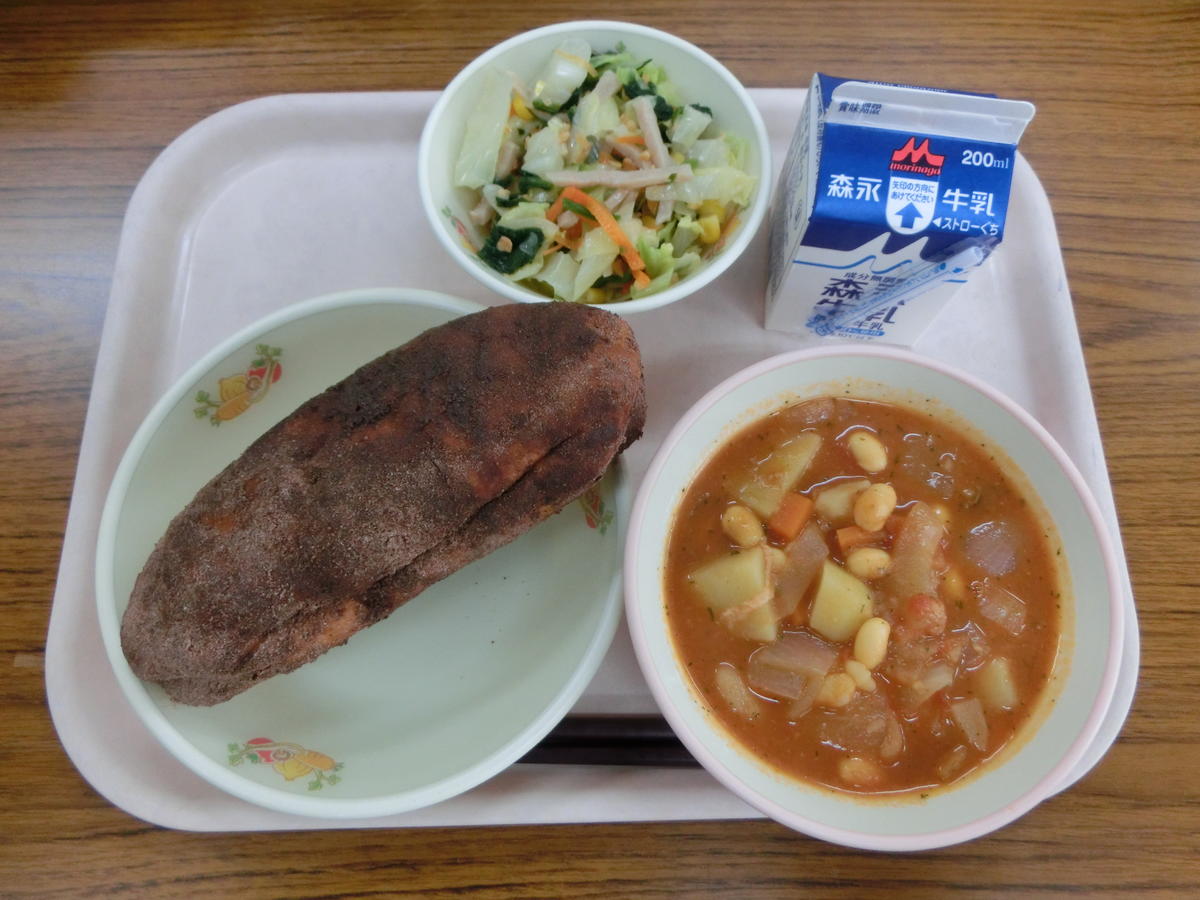 | ココアあげパン ポークビーンズ ほうれんそうのサラダ 牛乳 |