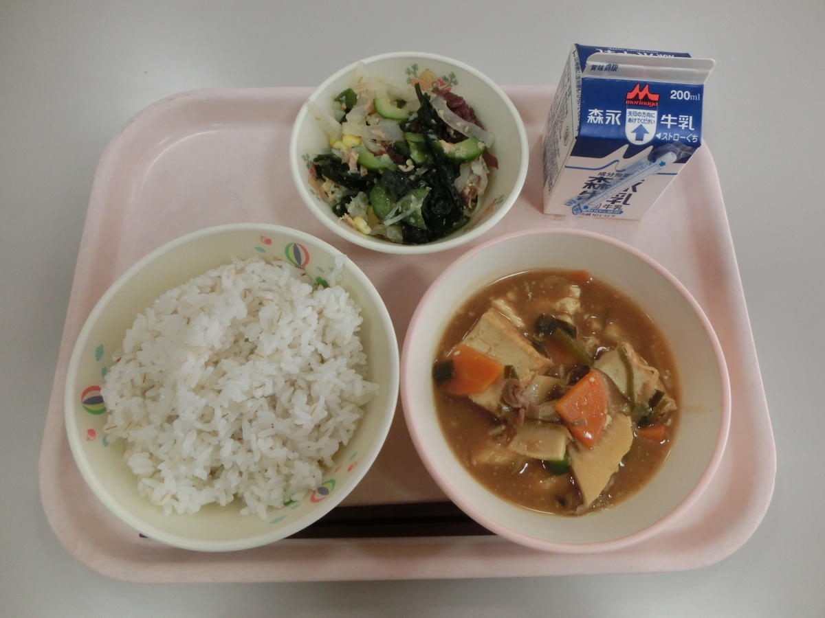 | むぎごはん ジャーチャンとうふ かいそうサラダ 牛乳 |