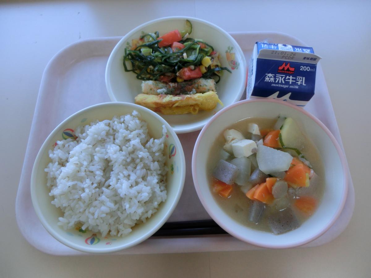 | むぎごはん ぶたじる りっちゃんのげんきサラダ ちくわの2しょくあげ 牛乳 |