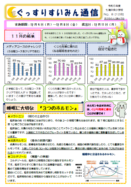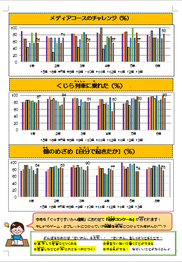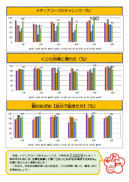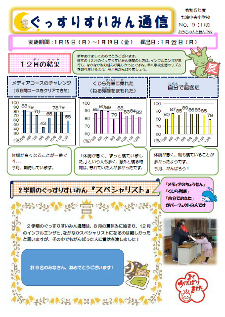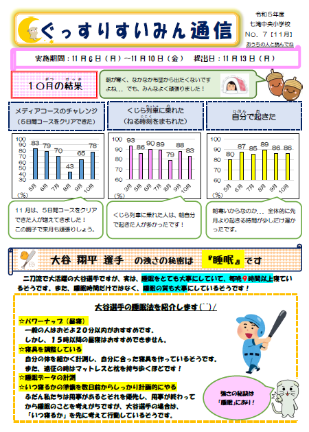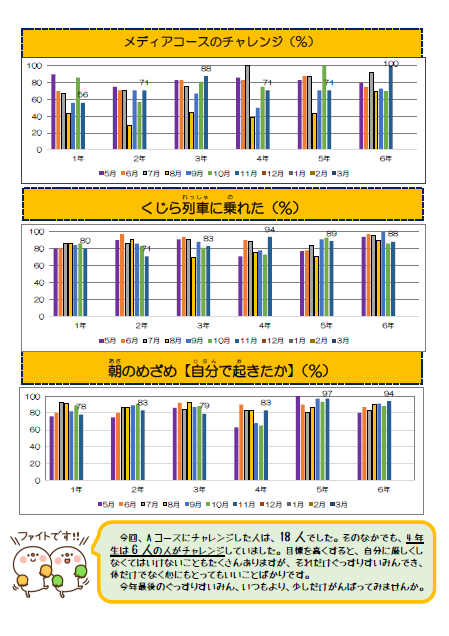 朝晩の冷え込みからか、先月のぐっすりすいみん週間では、全体的に少しだけ起きるのが遅くなっていましたが、メディアコースを5つ達成できた人は増えていました