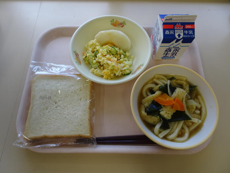 今日のメニュー :わかめごはん、豚肉となすのうどん、ほうれん草サラダ、牛乳