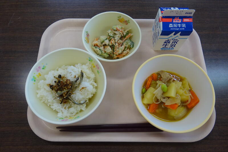 今日のメニュー:チキンカレーライス、わかめとツナのごまサラダ、牛乳