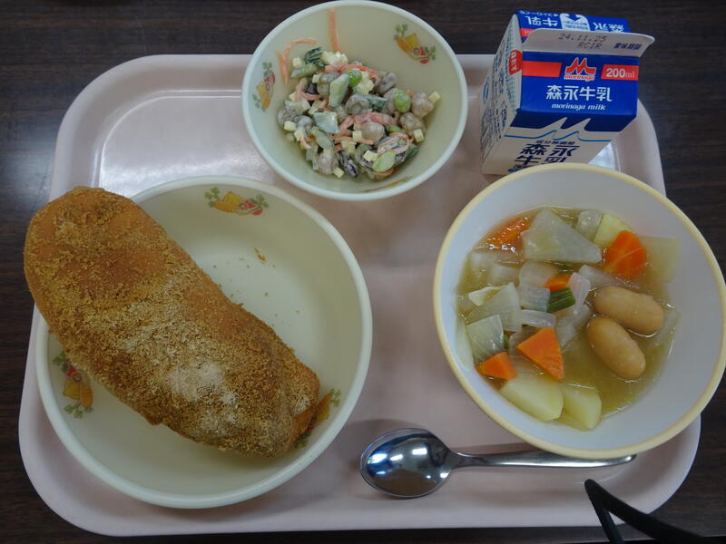 今日のメニュー :揚げパン、ポトフ、コロコロビーンズサラダ、牛乳