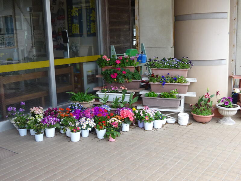 田中先生がお世話してくださり、玄関前は色とりどりの花のプランターが並んでいます。