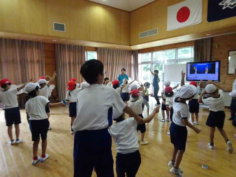 1~3年生が初めてダンスの練習をしました。職場体験に来ている中学生も一緒です。