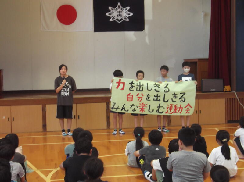 また、運動会の結団式をしました。児童会の子供たちが今年の運動会のスローガンを紹介しました。