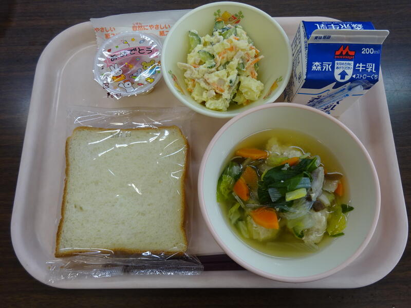 本日の献立:食パン・手作り肉団子スープ・ポテトサラダ・お祝いゼリー
