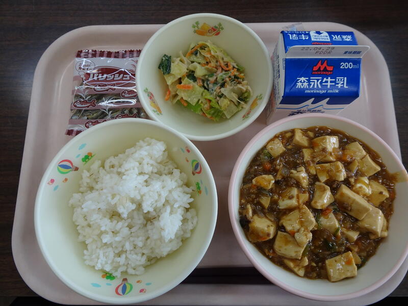 本日の献立:麦ごはん・マーボー豆腐・春雨の中華風酢の物・牛乳