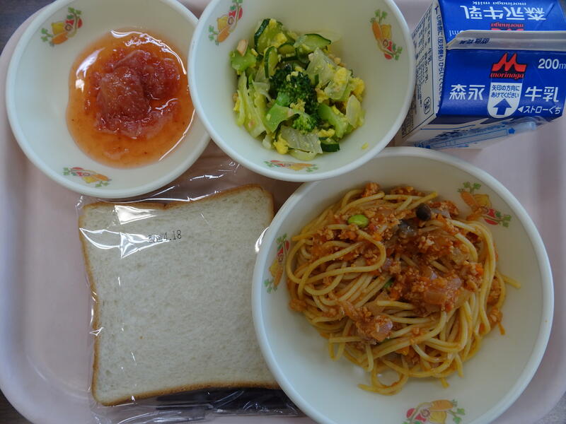 本日の献立:食パン・スパゲティミートソース・グリーエッグサラダ・手作りイチゴジャム