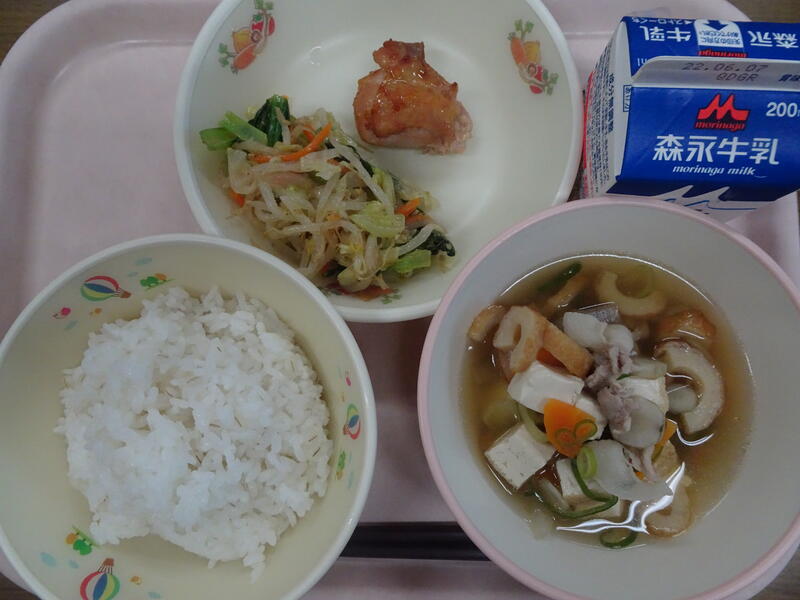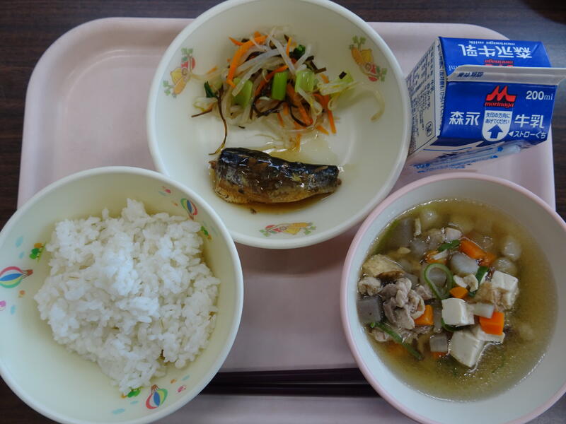 本日の献立:麦ごはん・豚汁・いわしのみぞれ煮・レモン和え・牛乳