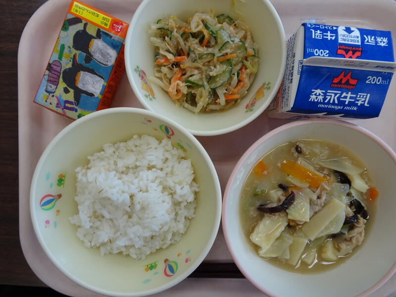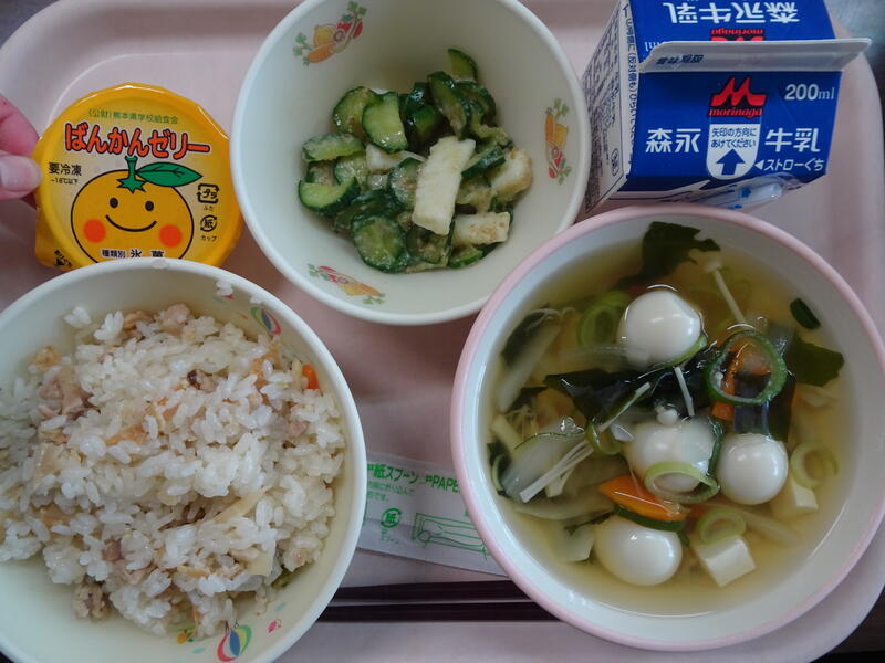 本日の献立:たけのこごはん・うずらの卵のすまし汁・いかの酢味噌あえ・熊本産ばんかんゼリー