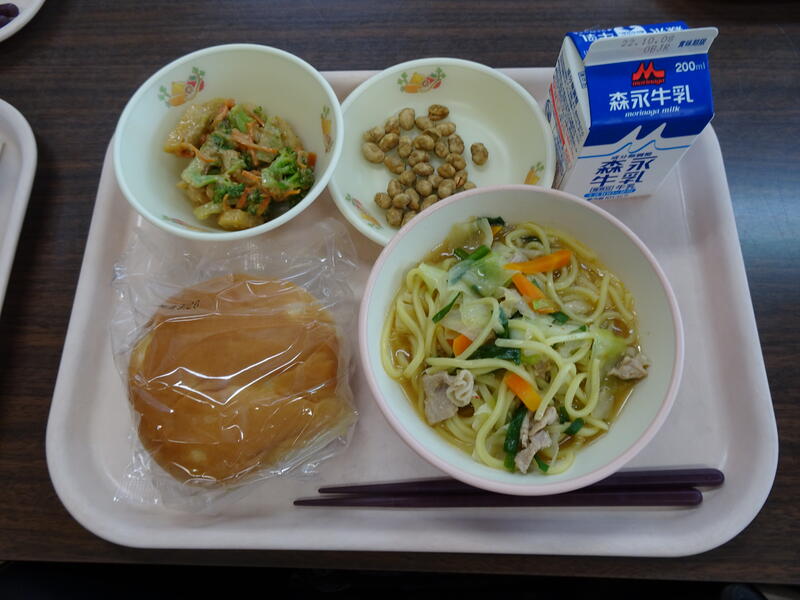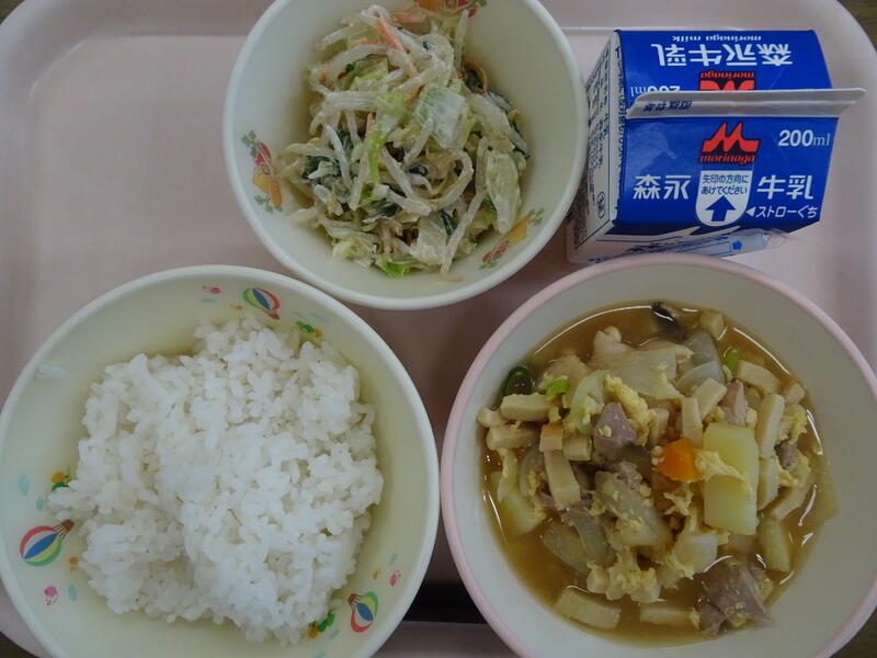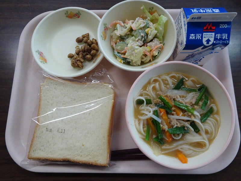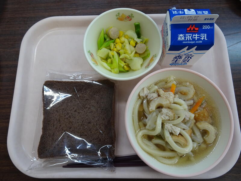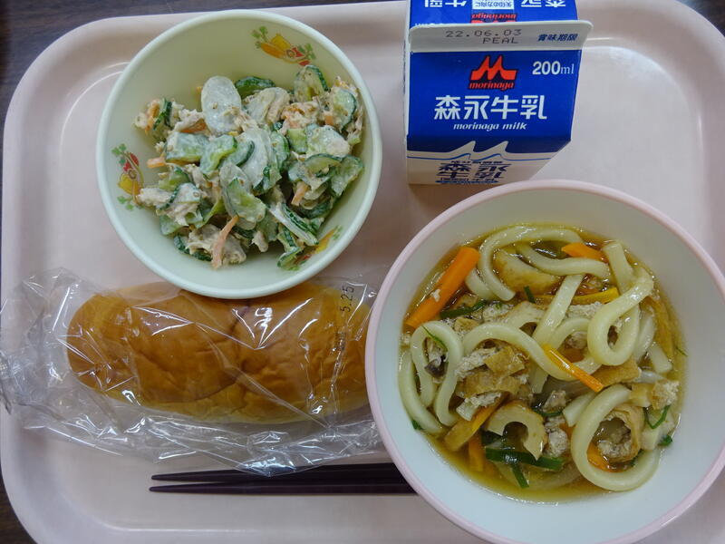 本日の献立:ミルクパン・きつねうどん・ごぼうサラダ・牛乳
