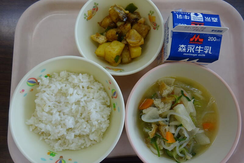 本日の献立:麦ごはん・かしわ汁・きびなごのカリカリフライ・サラたまサラダ
