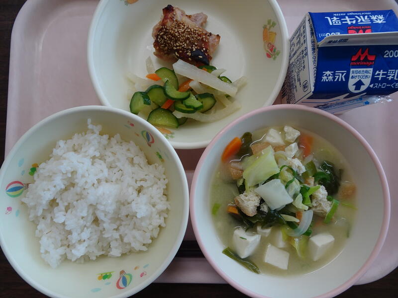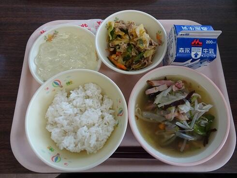 本日の献立:麦ご飯、牛乳、中華スープ、豚キムチ、手作りうめゼリー