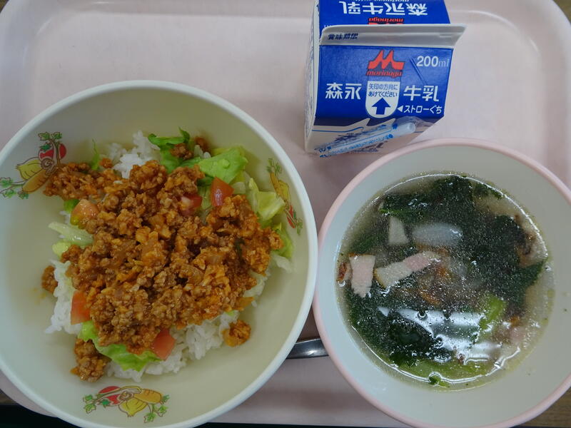 本日の献立:シシリアンライス(麦ごはん・シシリアンライスの肉・シシリアンライスの野菜)・わかめと卵のスープ・牛乳