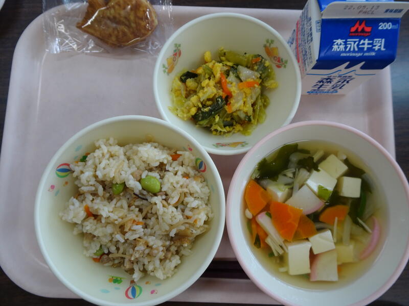 本日の献立:梅じゃこごはん・大豆の磯煮・野菜のごまあえ・牛乳