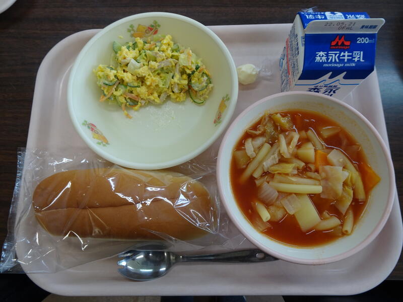 本日の献立:食パン・ミネストローネ・ツナマヨサラダ・ブルーベリーヨーグルト・牛乳