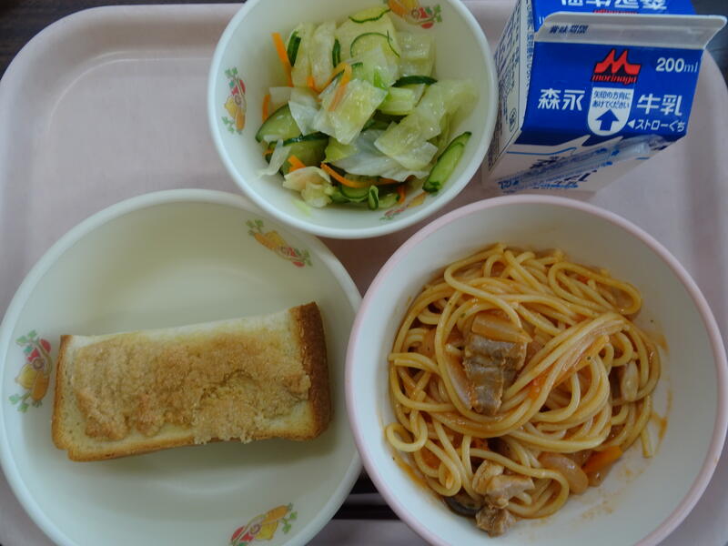 本日の献立:ガーリックトースト・クリームスパゲティ・キャベツパインサラダ・牛乳