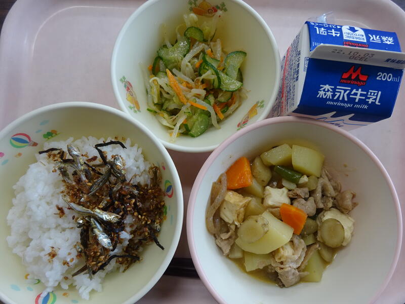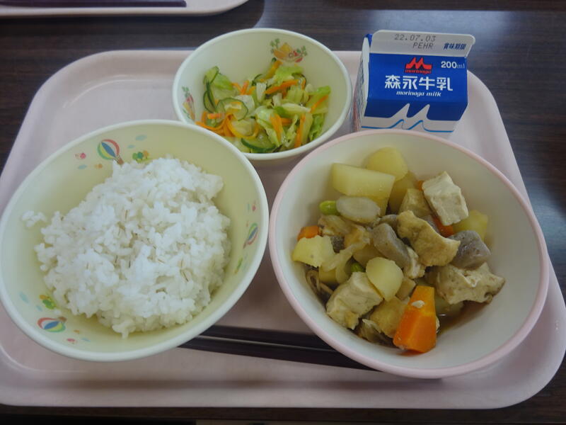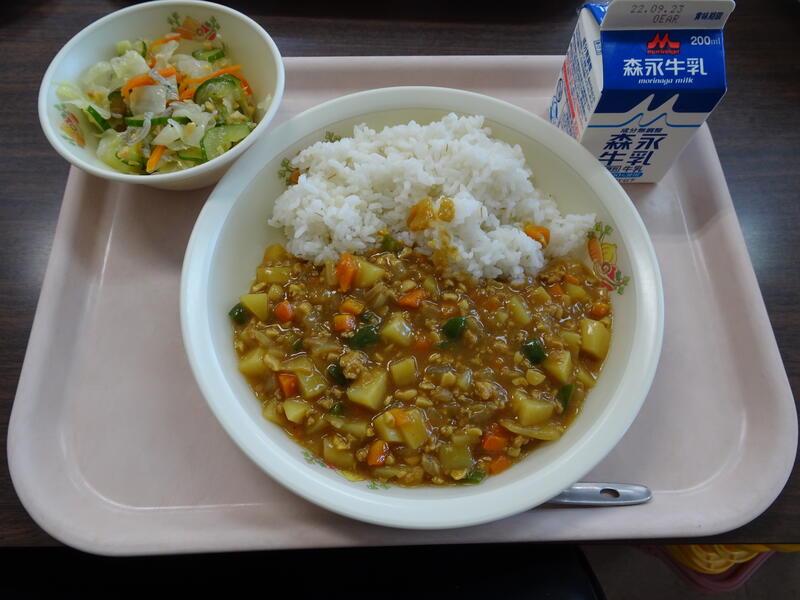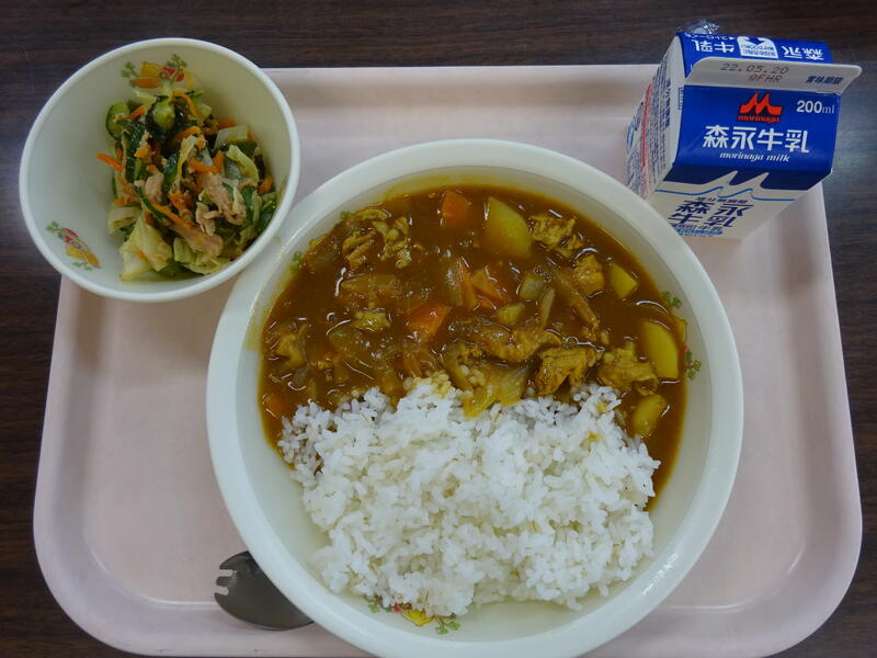 献立:カレーライス(麦ごはん・チキンカレールウ)・冷しゃぶサラダ・牛乳