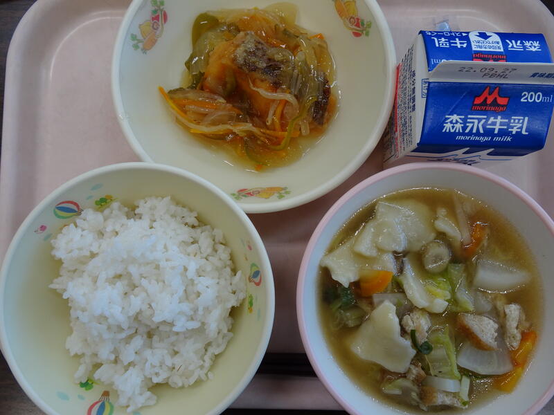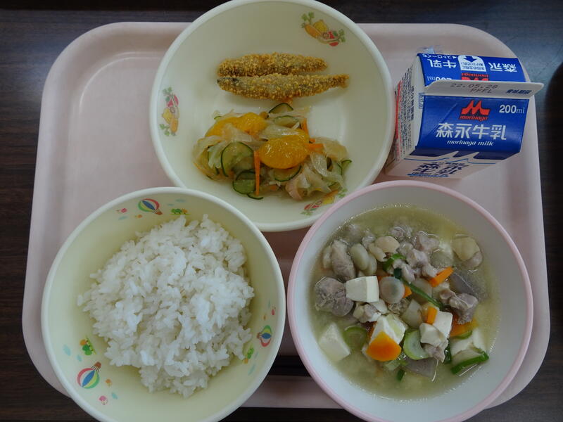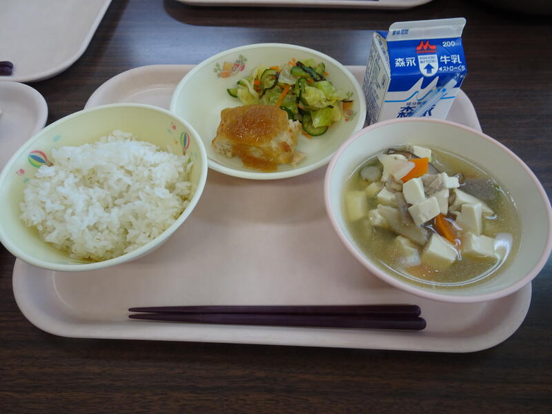 本日の献立:麦ごはん・だんご汁・熊本県産真鯛の甘酢あんかけ・牛乳