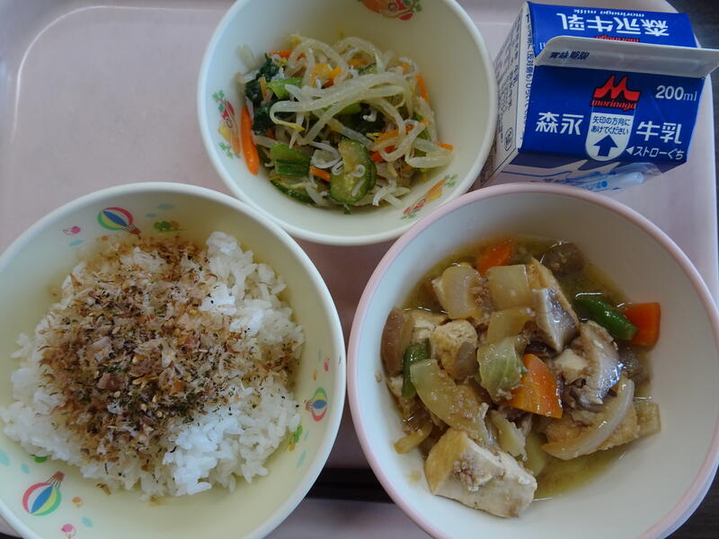 本日の献立:麦ごはん・なす入りマーボー豆腐・御船川とささみのごまサラダ・牛乳