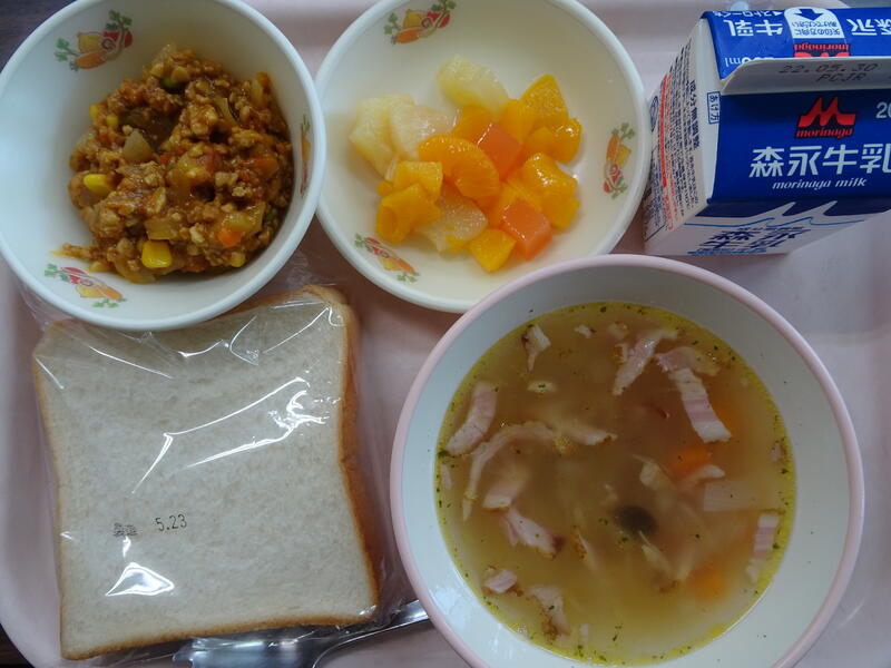 本日の献立:食パン・コンソメスープ・カレーミートビーンズ・フルーツカクテル・牛乳