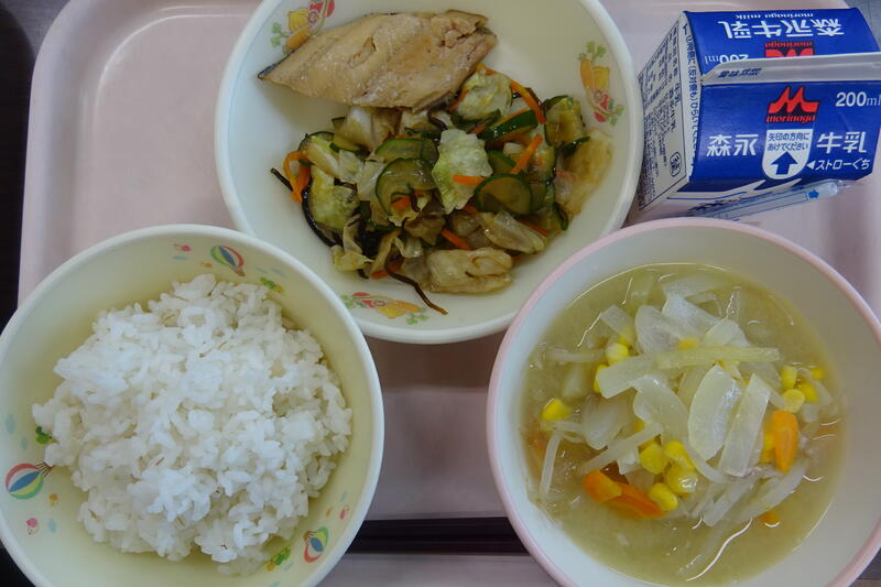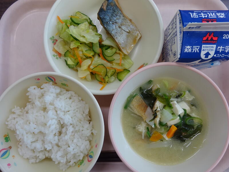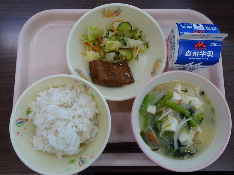 本日の献立:麦ごはん・みそ汁・さばの煮つけ・キャベツの甘酢あえ・牛乳