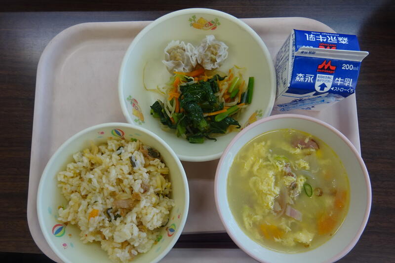 本日の献立:キムチご飯・コーンと卵のスープ・シューマイ・小松菜の中華和え