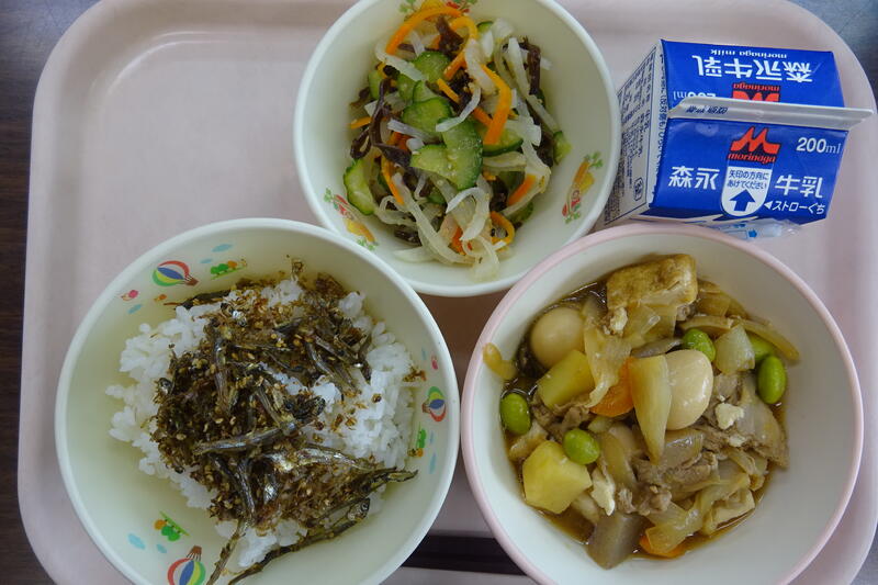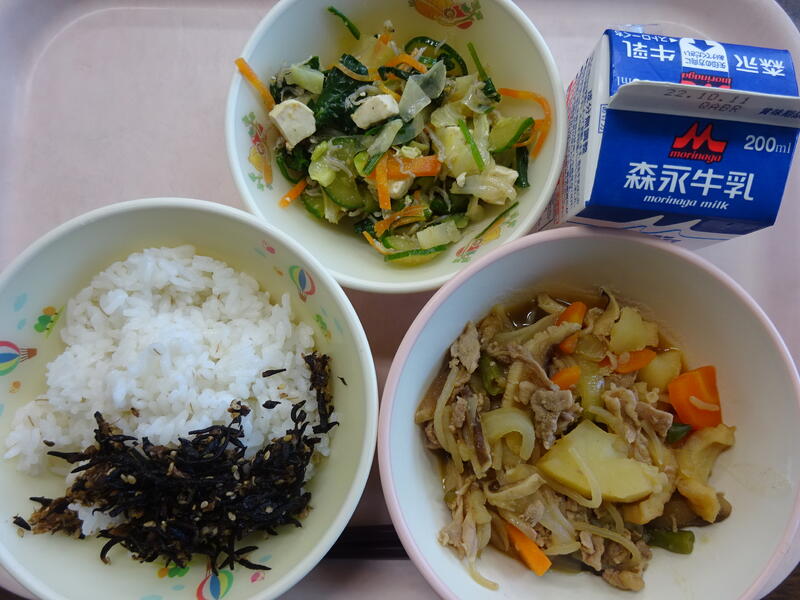 本日の献立:麦ごはん・肉じゃが・豆腐サラダ・手作りひじきふりかけ・牛乳