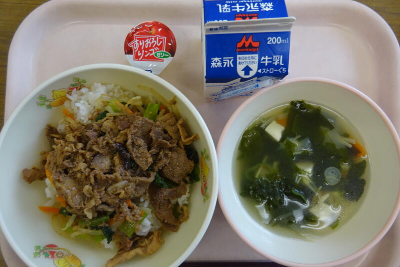 本日の献立:麦ごはん・中華風かき玉スープ・焼き肉風炒め・ヨーグルト・牛乳