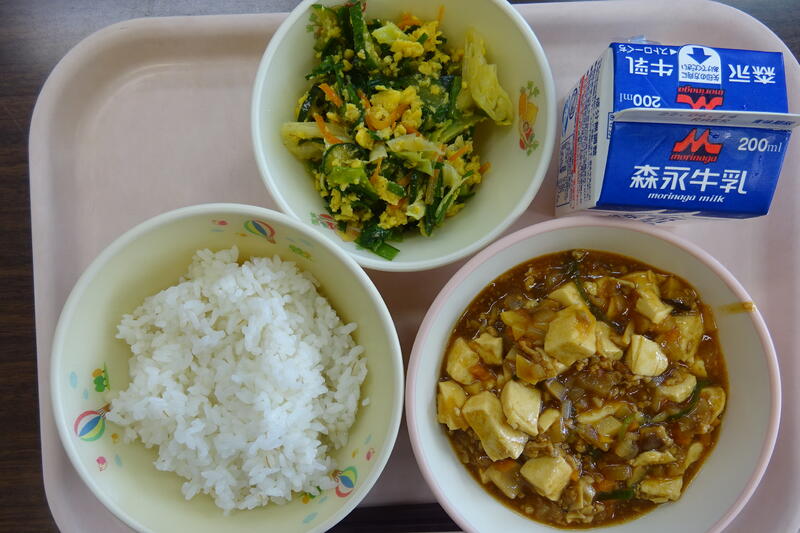 本日の献立:麦ごはん・マーボー豆腐・にらと卵のサラダ・牛乳
