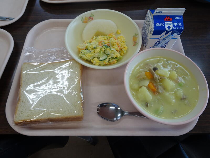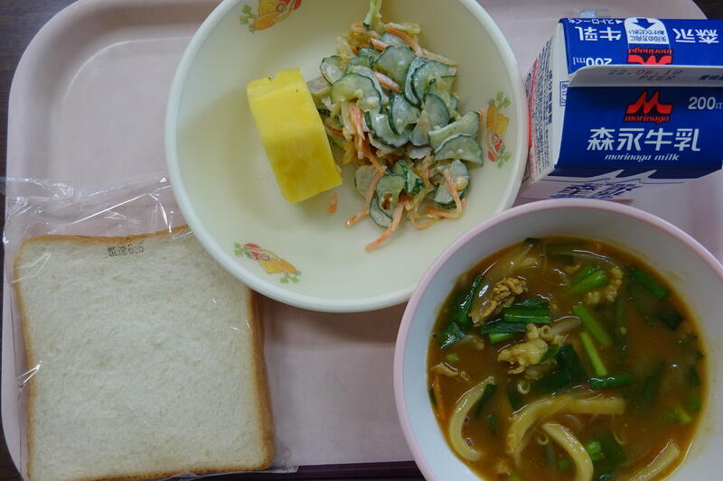 本日の献立:食パン・カレーうどん・かみかみサラダ・パイン・牛乳