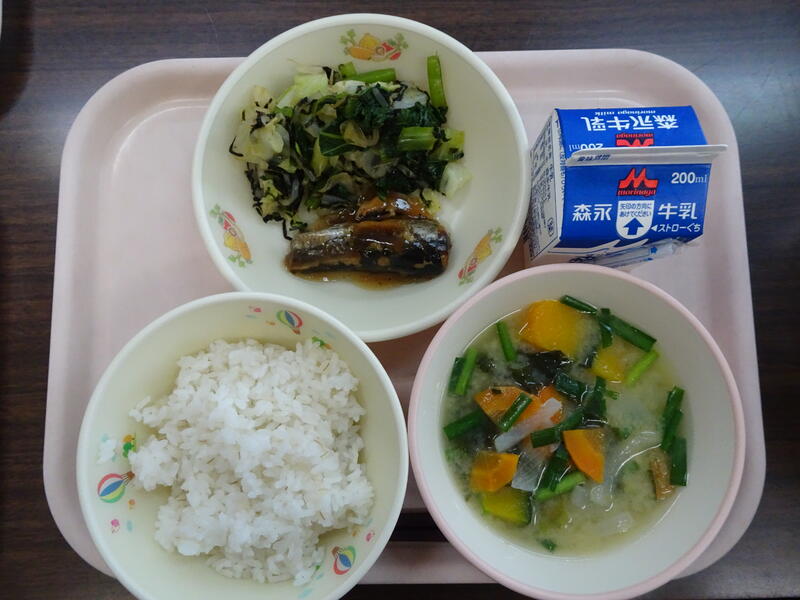 本日の献立:麦ごはん・かぼちゃとにらのみそ汁・いわしの梅煮・小松菜の磯和え・牛乳
