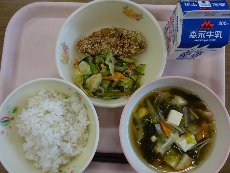 本日の献立:麦ごはん・けんちん汁・春雨の酢の物・きびなごごまフライ・牛乳