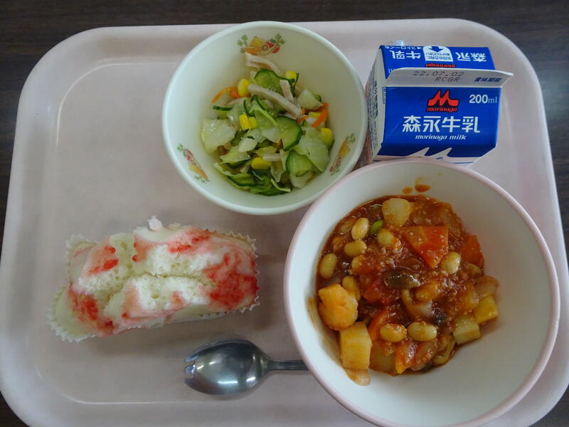 本日の献立:イチゴ蒸しパン・大豆とひき肉のトマト煮・コーンサラダ・牛乳